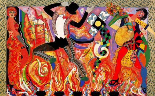 Nous vous proposons une reproduction artisanale sur toile du célèbre tableau 'Maître des cérémonies' de Miriam Schapiro, provenant du Musée de la Reproduction.