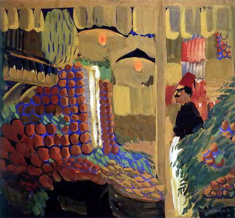 Nous vous proposons une reproduction artisanale sur toile du célèbre tableau 'Magasin de fruits' de Martiros Saryan, provenant du Musée de la Reproduction.