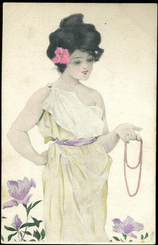 Nous vous proposons une reproduction artisanale sur toile du célèbre tableau 'Maid of Athènes' de Raphael Kirchner, provenant du Musée de la Reproduction.