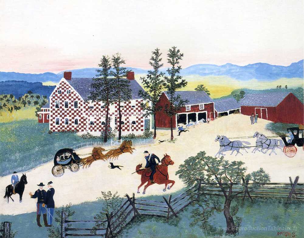 Nous vous proposons une reproduction artisanale sur toile du célèbre tableau 'Maison à carreaux' de Grandma Moses, provenant du Musée de la Reproduction.