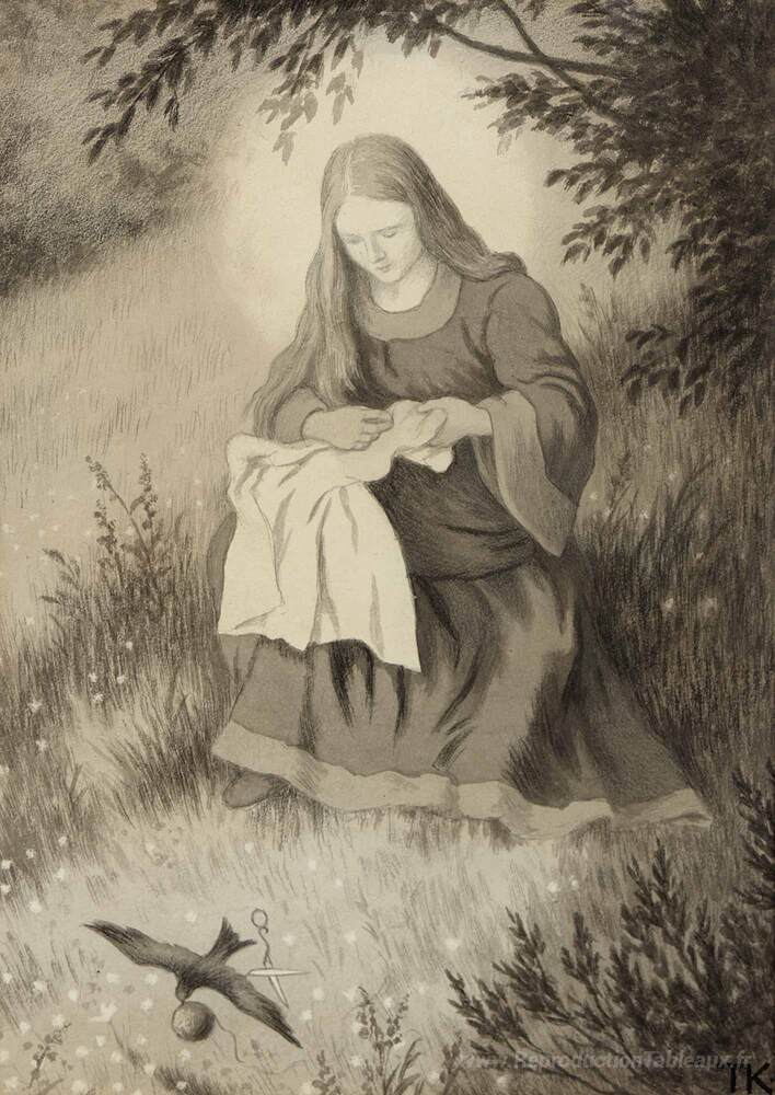 Nous vous proposons une reproduction artisanale sur toile du célèbre tableau 'Maria Jomfru Og Svalen' de Theodor Severin Kittelsen, provenant du Musée de la Reproduction.