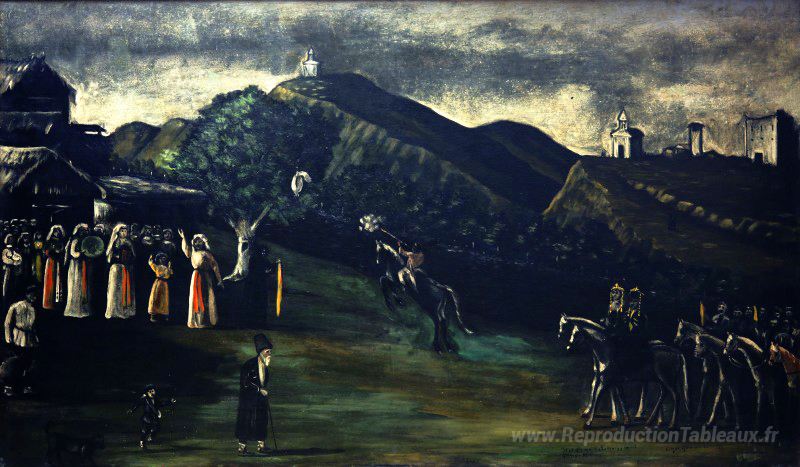 Nous vous proposons une reproduction artisanale sur toile du célèbre tableau 'Mariage dans l'ancienne Géorgie' de Niko Pirosmani, provenant du Musée de la Reproduction.