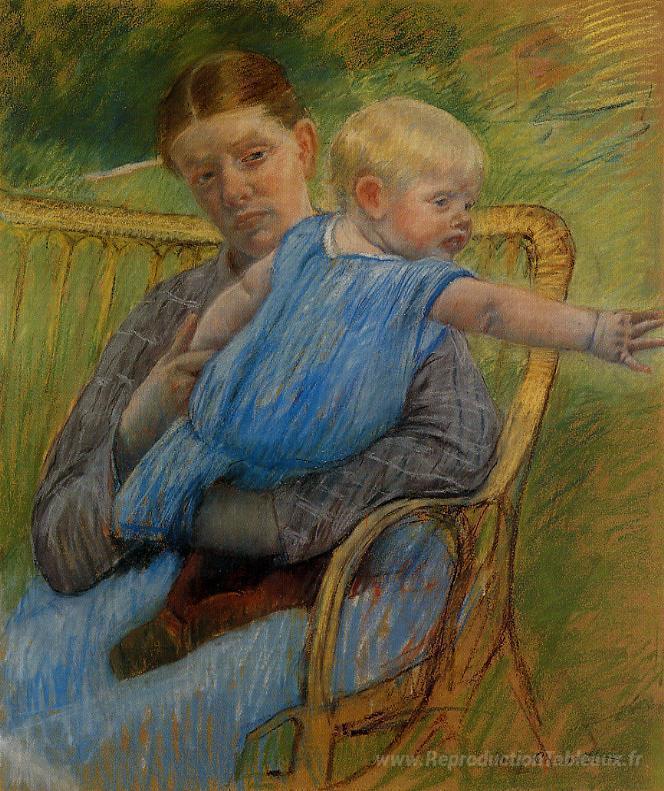 Nous vous proposons une reproduction artisanale sur toile du célèbre tableau 'Mathilde tenant un bébé qui tend la main à droite' de Mary Cassatt, provenant du Musée de la Reproduction.