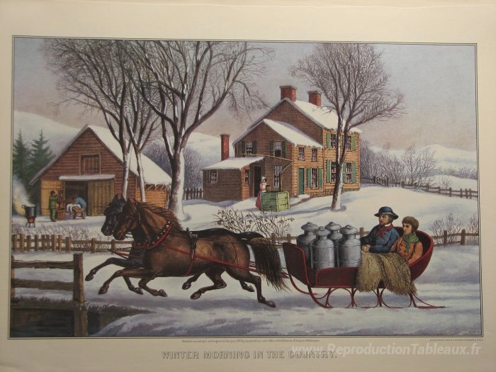 Nous vous proposons une reproduction artisanale sur toile du célèbre tableau 'Matin d'hiver dans le pays' de Currier and Ives, provenant du Musée de la Reproduction.
