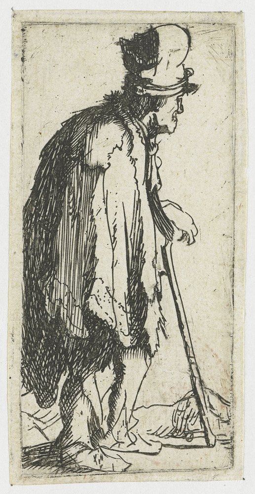 Nous vous proposons une reproduction artisanale sur toile du célèbre tableau 'Mendiant avec une main estropiée se penchant sur un bâton' de Rembrandt, provenant du Musée de la Reproduction.