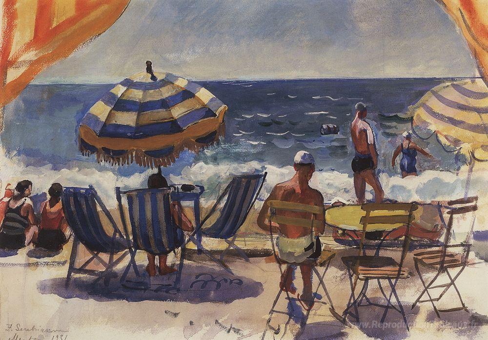 Nous vous proposons une reproduction artisanale sur toile du célèbre tableau 'Menton. Plage avec parapluies' de Zinaida Serebriakova, provenant du Musée de la Reproduction.