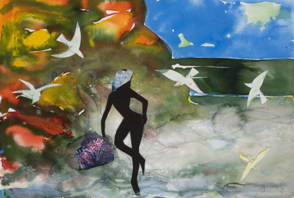 Nous vous proposons une reproduction artisanale sur toile du célèbre tableau 'Mer calme' de Romare Bearden, provenant du Musée de la Reproduction.