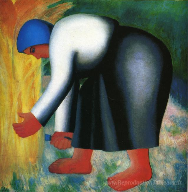 Nous vous proposons une reproduction artisanale sur toile du célèbre tableau 'moissonneuse' de Kazimir Malevich, provenant du Musée de la Reproduction.