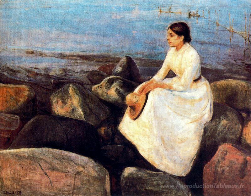 Nous vous proposons une reproduction artisanale sur toile du célèbre tableau 'Nuit d'été (Inger sur le rivage)' de Edvard Munch, provenant du Musée de la Reproduction.