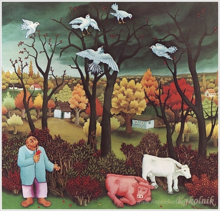 Nous vous proposons une reproduction artisanale sur toile du célèbre tableau 'Oiseaux blancs' de Ivan Generalic, provenant du Musée de la Reproduction.