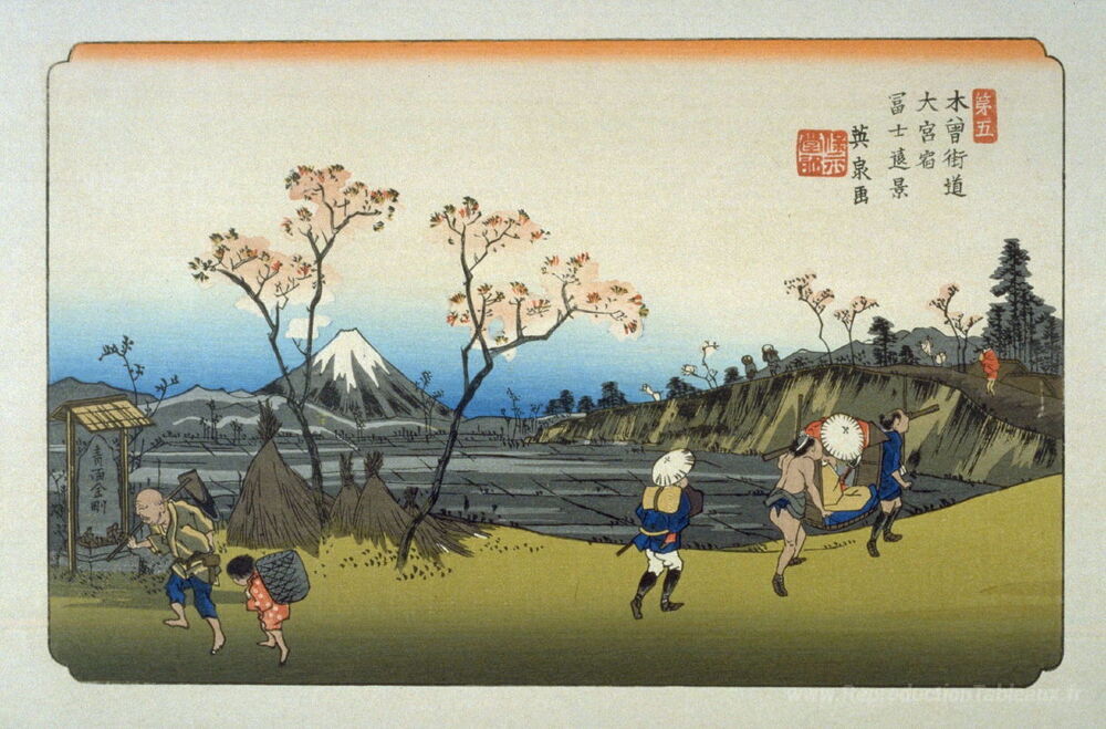 Nous vous proposons une reproduction artisanale sur toile du célèbre tableau 'Omiya, pl. 5 d'une édition en fac-similé de soixante-neuf statio' de Keisai Eisen, provenant du Musée de la Reproduction.
