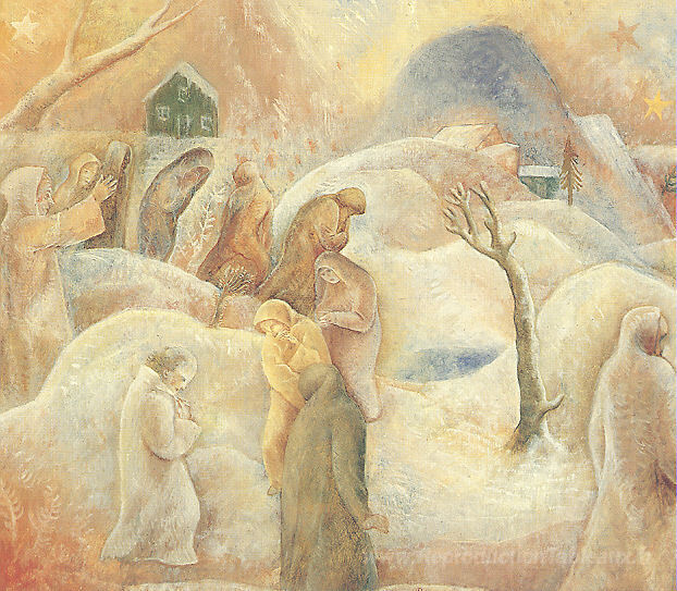 Nous vous proposons une reproduction artisanale sur toile du célèbre tableau 'Pèlerins dans la neige' de Albert Bloch, provenant du Musée de la Reproduction.