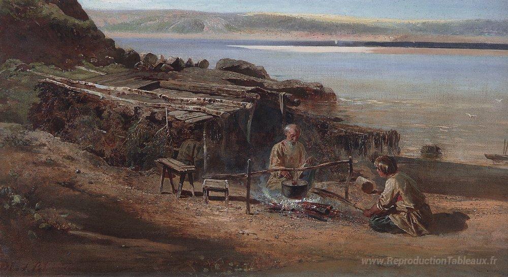 Nous vous proposons une reproduction artisanale sur toile du célèbre tableau 'Pêcheurs sur la Volga' de Aleksey Savrasov, provenant du Musée de la Reproduction.