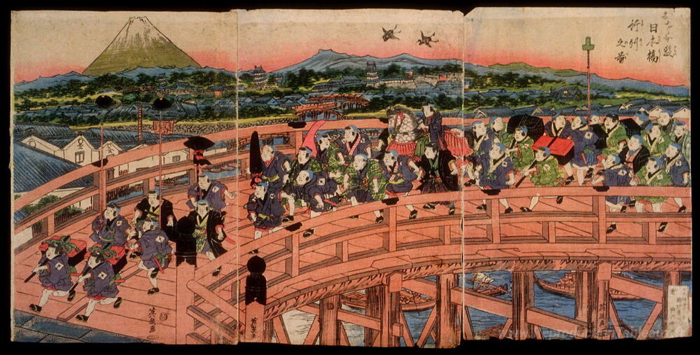 Nous vous proposons une reproduction artisanale sur toile du célèbre tableau 'Pasmes pour enfants: une procession sur le pont Nihon' de Keisai Eisen, provenant du Musée de la Reproduction.