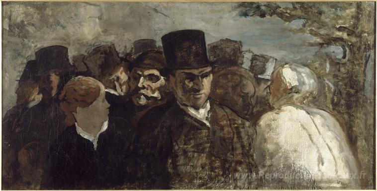 Nous vous proposons une reproduction artisanale sur toile du célèbre tableau 'Passants par' de Honore Daumier, provenant du Musée de la Reproduction.