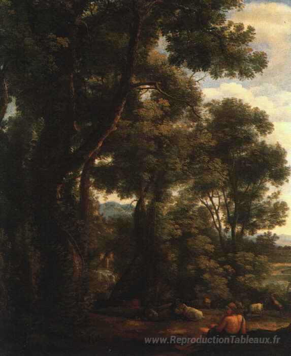 Nous vous proposons une reproduction artisanale sur toile du célèbre tableau 'Paysage avec goatherd' de Claude Lorrain, provenant du Musée de la Reproduction.
