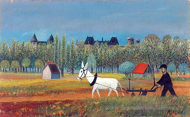 Nous vous proposons une reproduction artisanale sur toile du célèbre tableau 'Paysan travaillant dans un champ' de David Burliuk, provenant du Musée de la Reproduction.