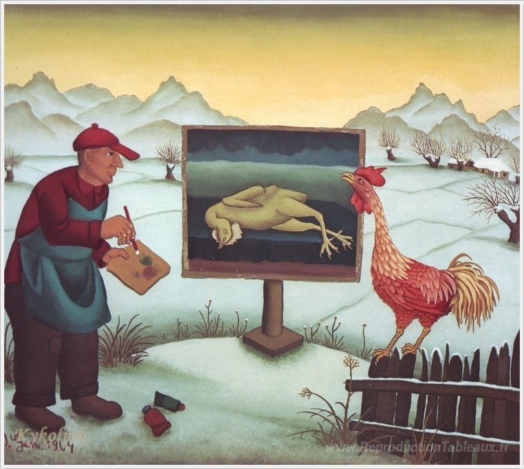 Nous vous proposons une reproduction artisanale sur toile du célèbre tableau 'Peinture en hiver' de Ivan Generalic, provenant du Musée de la Reproduction.