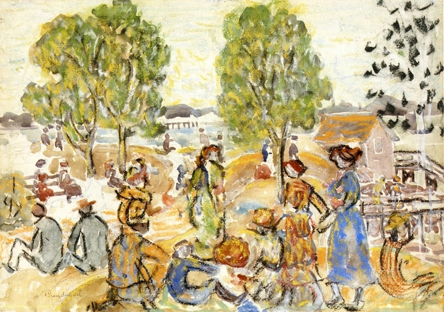 Nous vous proposons une reproduction artisanale sur toile du célèbre tableau 'Pique-nique' de Maurice Prendergast, provenant du Musée de la Reproduction.