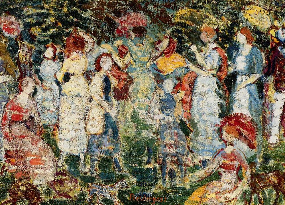 Nous vous proposons une reproduction artisanale sur toile du célèbre tableau 'Pique-nique' de Maurice Prendergast, provenant du Musée de la Reproduction.