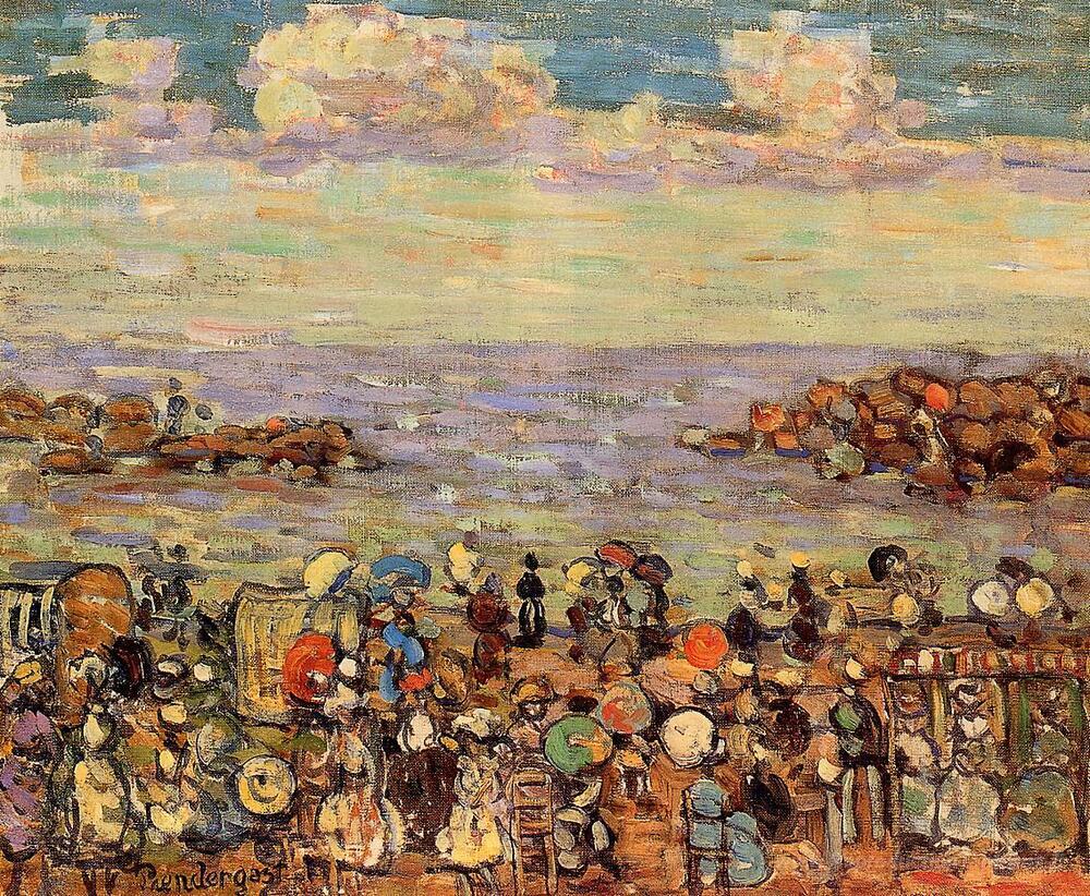 Nous vous proposons une reproduction artisanale sur toile du célèbre tableau 'Plage à St. Malo' de Maurice Prendergast, provenant du Musée de la Reproduction.