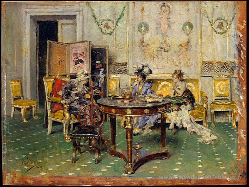 Nous vous proposons une reproduction artisanale sur toile du célèbre tableau 'Potins' de Giovanni Boldini, provenant du Musée de la Reproduction.