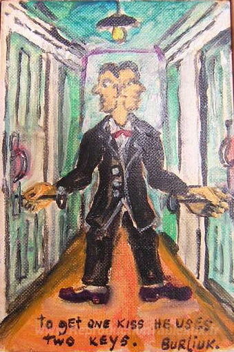 Nous vous proposons une reproduction artisanale sur toile du célèbre tableau 'Pour obtenir un baiser, il utilise deux clés' de David Burliuk, provenant du Musée de la Reproduction.
