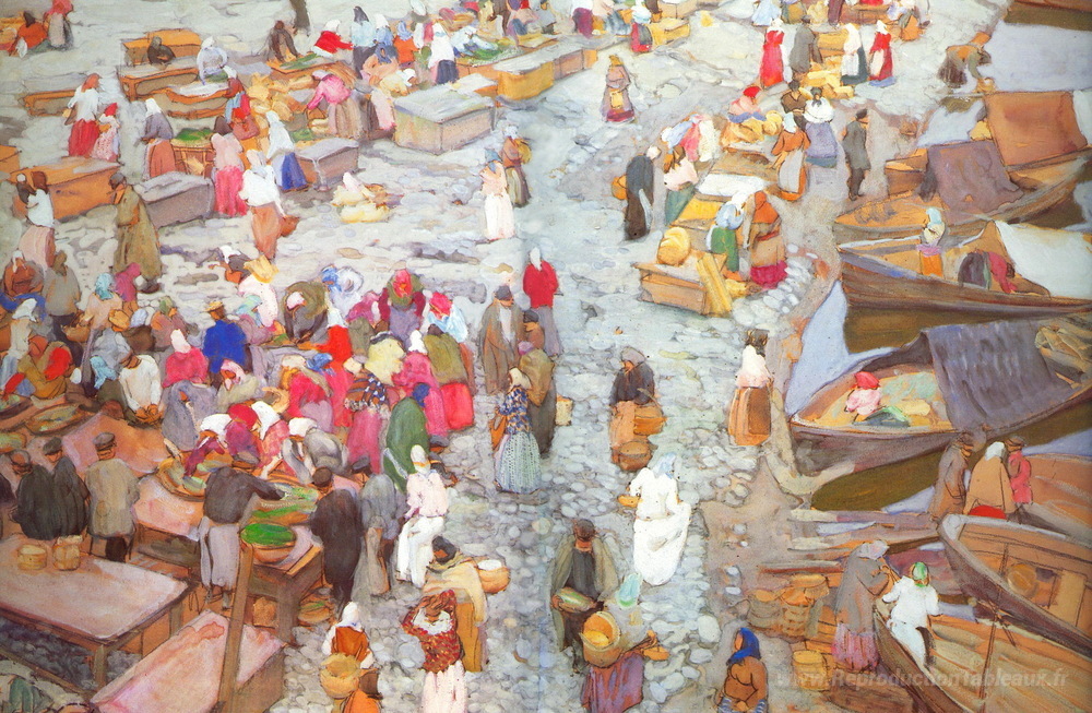 Nous vous proposons une reproduction artisanale sur toile du célèbre tableau 'Près de la rive de la rivière Pskova' de Konstantin Yuon, provenant du Musée de la Reproduction.