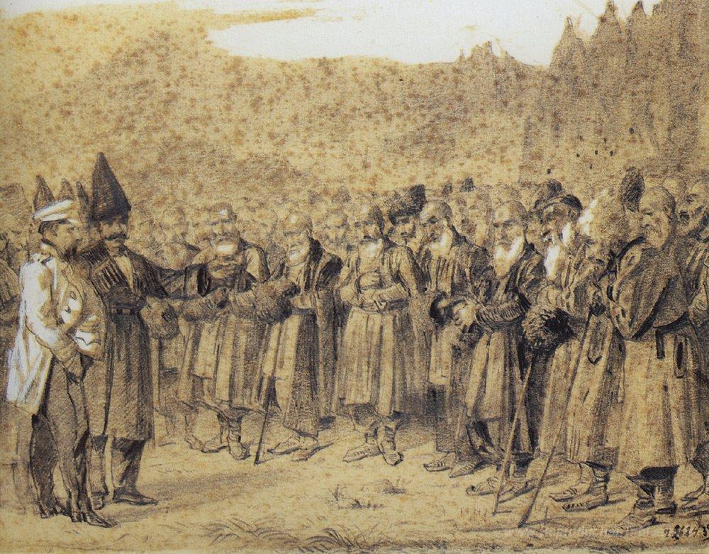 Nous vous proposons une reproduction artisanale sur toile du célèbre tableau 'Présentation des patrons (officier russe et Caucasiens)' de Vasily Vereshchagin, provenant du Musée de la Reproduction.