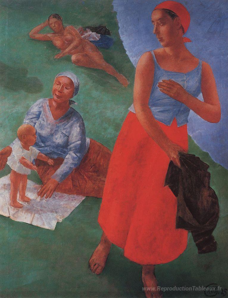 Nous vous proposons une reproduction artisanale sur toile du célèbre tableau 'Premiers pas' de Kuzma Petrov-Vodkin, provenant du Musée de la Reproduction.
