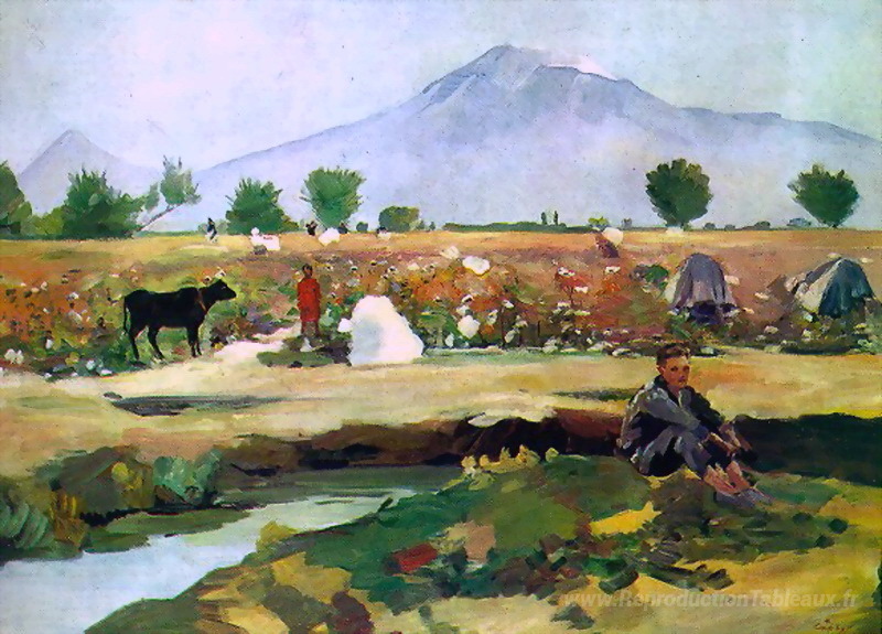 Nous vous proposons une reproduction artisanale sur toile du célèbre tableau 'Prendre du coton dans la vallée d'Ararat' de Martiros Saryan, provenant du Musée de la Reproduction.