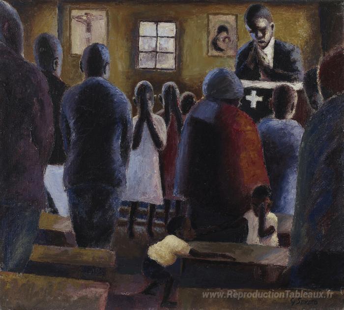Nous vous proposons une reproduction artisanale sur toile du célèbre tableau 'Prière à l'église' de Gerard Sekoto, provenant du Musée de la Reproduction.