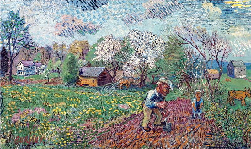 Nous vous proposons une reproduction artisanale sur toile du célèbre tableau 'Printemps en Pennsylvanie' de David Burliuk, provenant du Musée de la Reproduction.