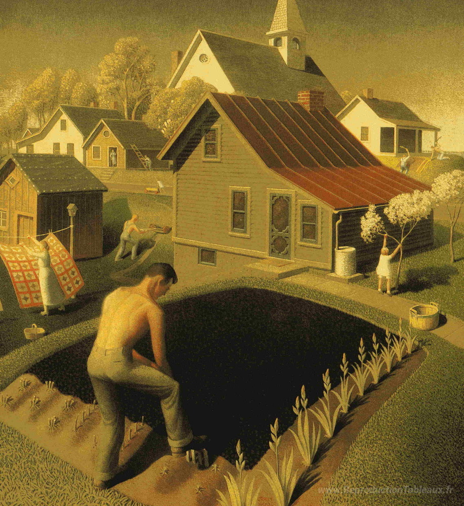 Nous vous proposons une reproduction artisanale sur toile du célèbre tableau 'Printemps en ville' de Grant Wood, provenant du Musée de la Reproduction.