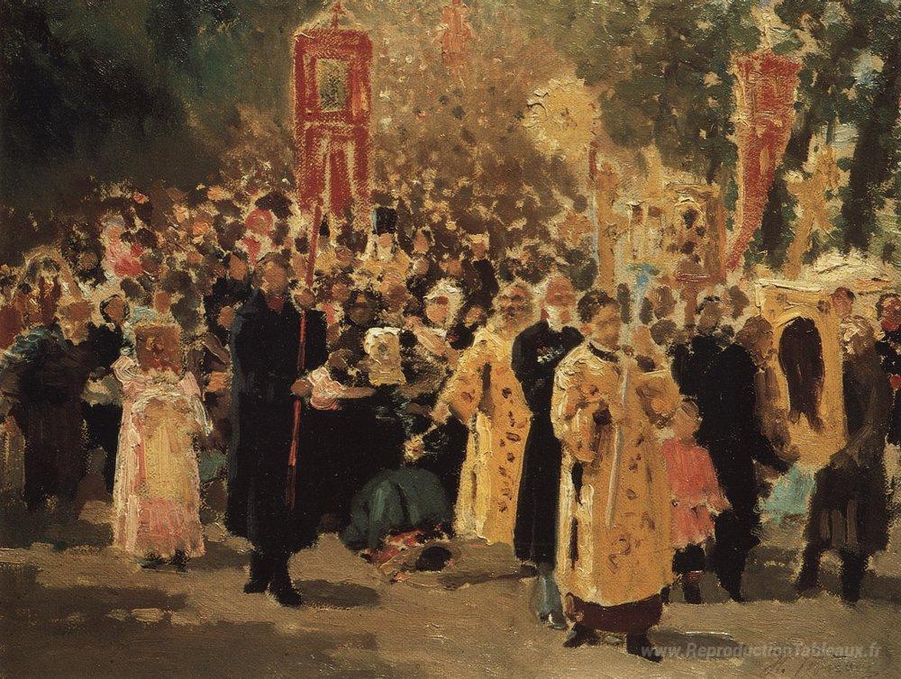 Nous vous proposons une reproduction artisanale sur toile du célèbre tableau 'Procession religieuse dans une forêt de chêne. Apparence de l'ic' de Ilya Repin, provenant du Musée de la Reproduction.