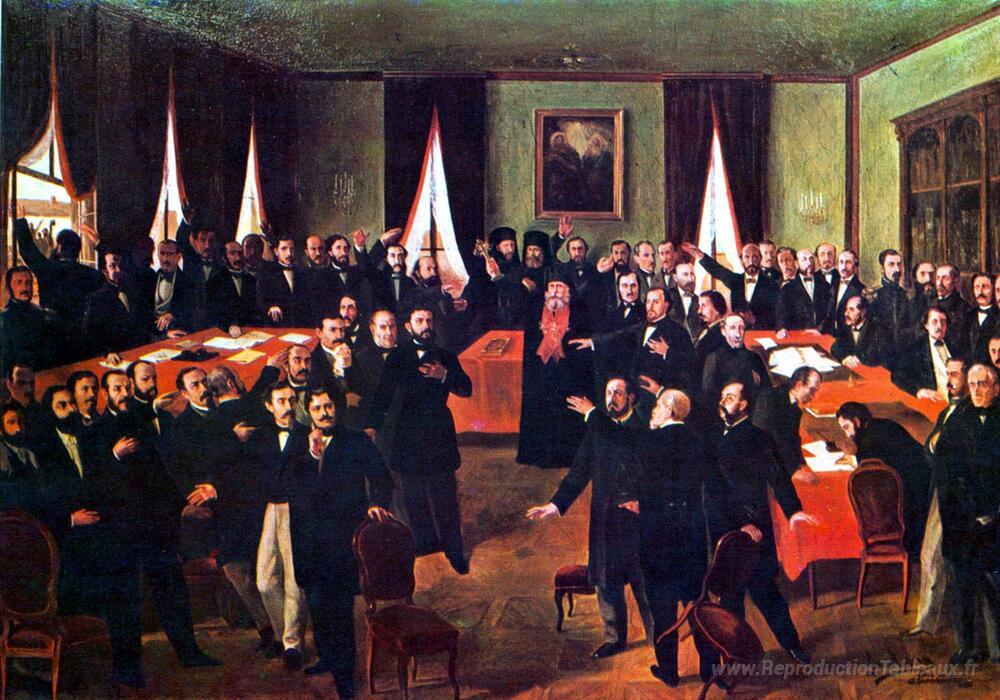 Nous vous proposons une reproduction artisanale sur toile du célèbre tableau 'Proclamer le syndicat' de Theodor Aman, provenant du Musée de la Reproduction.