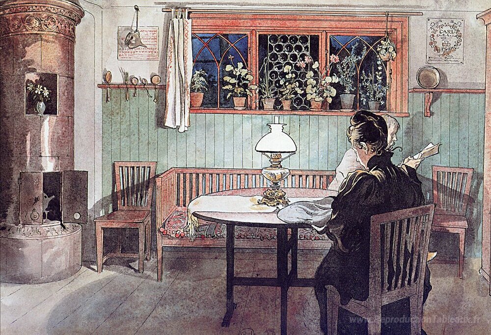 Nous vous proposons une reproduction artisanale sur toile du célèbre tableau 'Quand les enfants se sont couchés' de Carl Larsson, provenant du Musée de la Reproduction.