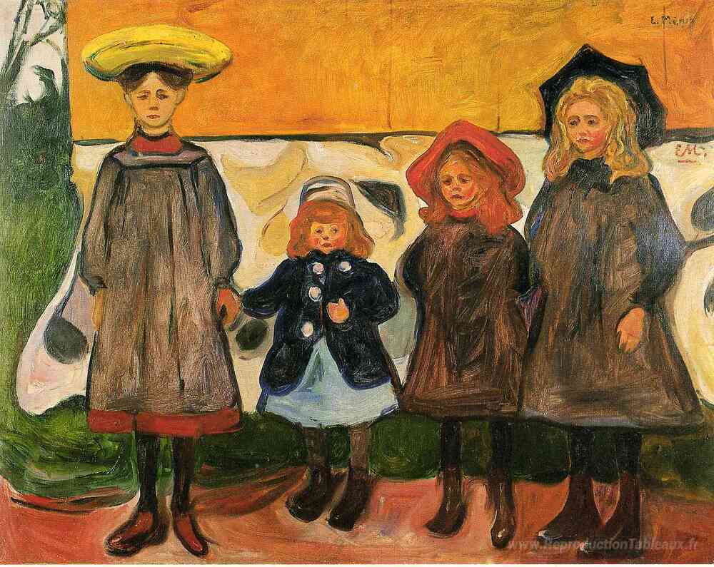 Nous vous proposons une reproduction artisanale sur toile du célèbre tableau 'Quatre filles à Arsgardtrand' de Edvard Munch, provenant du Musée de la Reproduction.