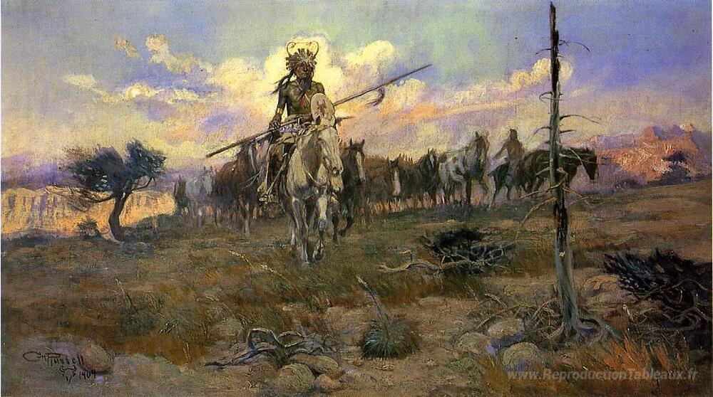 Nous vous proposons une reproduction artisanale sur toile du célèbre tableau 'Ramener à la maison le butin' de Charles M. Russell, provenant du Musée de la Reproduction.