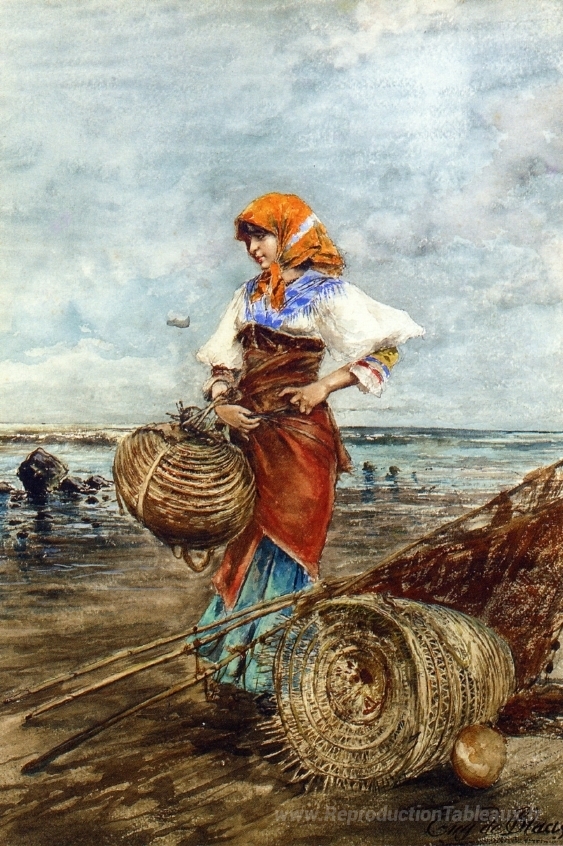 Nous vous proposons une reproduction artisanale sur toile du célèbre tableau 'Rassembler des coques au bord de la mer' de Eugene de Blaas, provenant du Musée de la Reproduction.