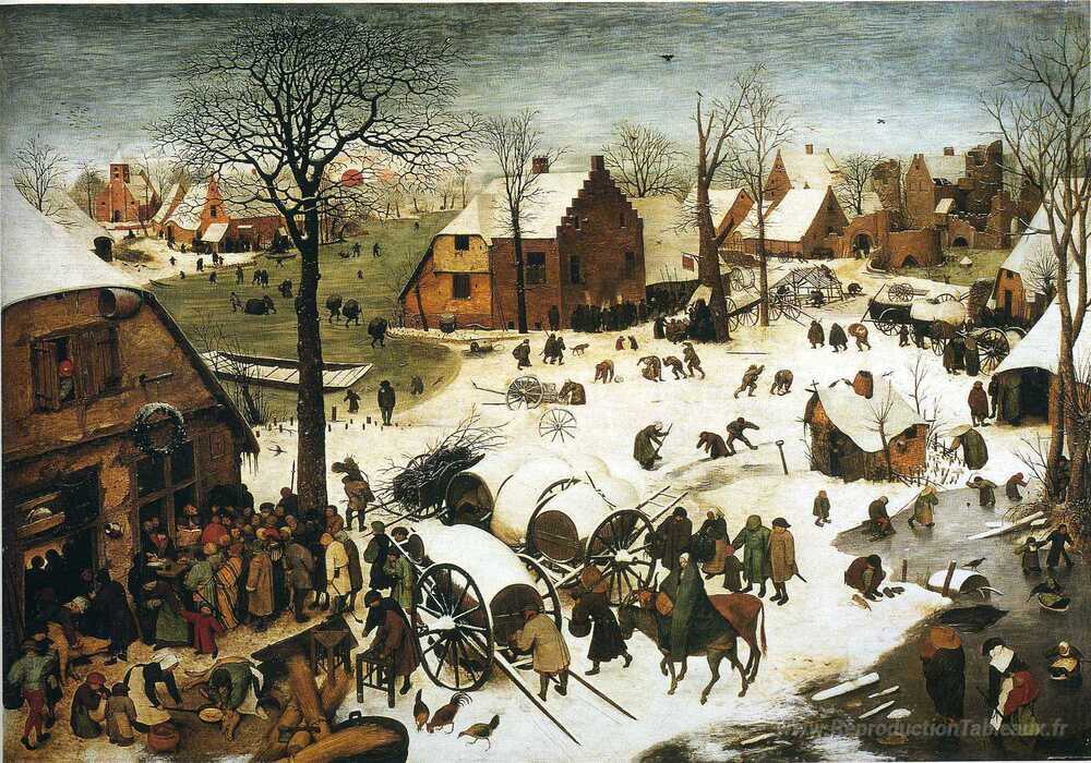 Nous vous proposons une reproduction artisanale sur toile du célèbre tableau 'Recensement à Bethléem' de Pieter Bruegel the Elder, provenant du Musée de la Reproduction.