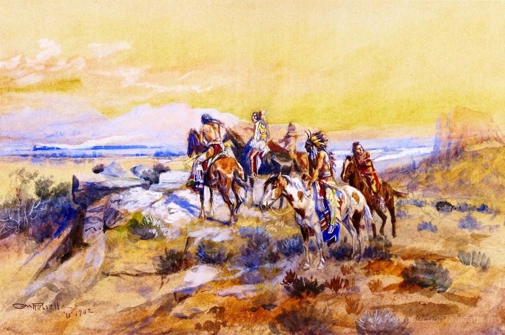 Nous vous proposons une reproduction artisanale sur toile du célèbre tableau 'Regarder le cheval de fer' de Charles M. Russell, provenant du Musée de la Reproduction.