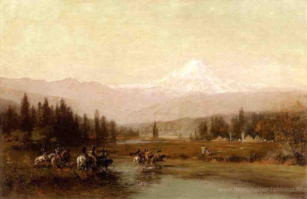 Nous vous proposons une reproduction artisanale sur toile du célèbre tableau 'Retour du parti de guerre' de Thomas Hill, provenant du Musée de la Reproduction.