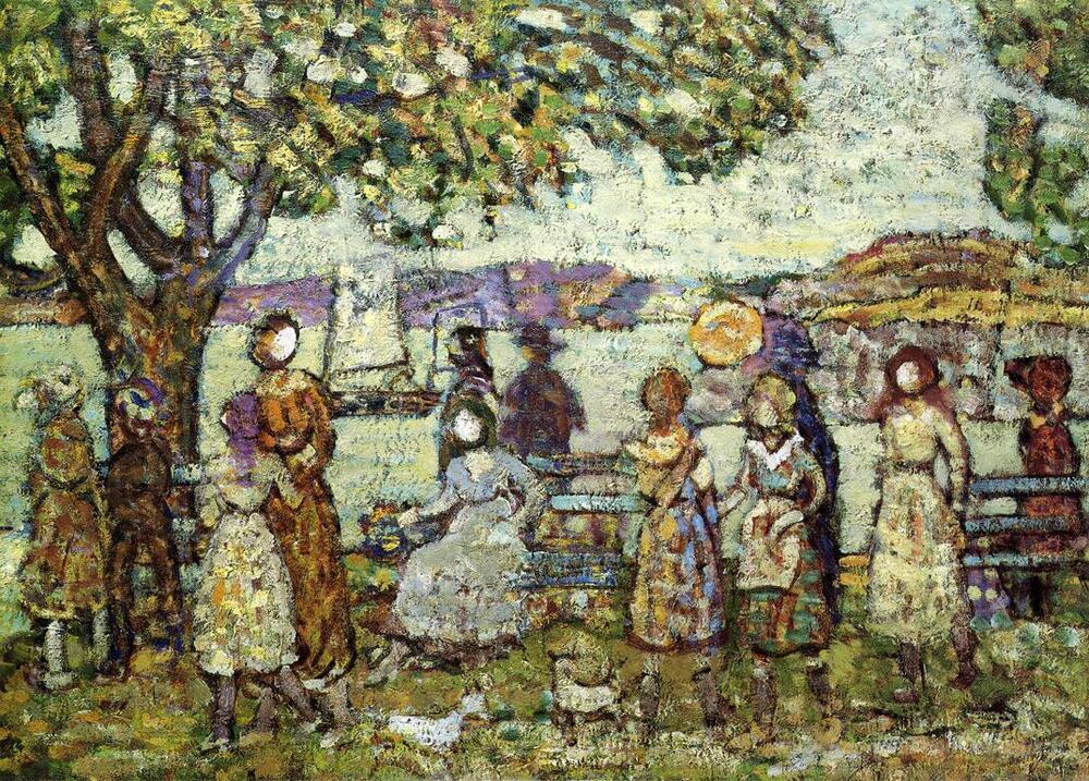 Nous vous proposons une reproduction artisanale sur toile du célèbre tableau 'Rivage' de Maurice Prendergast, provenant du Musée de la Reproduction.