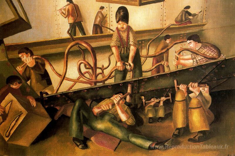 Nous vous proposons une reproduction artisanale sur toile du célèbre tableau 'Rivettatrici' de Stanley Spencer, provenant du Musée de la Reproduction.