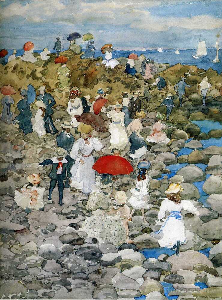 Nous vous proposons une reproduction artisanale sur toile du célèbre tableau 'Rocky Shore, Nantasket' de Maurice Prendergast, provenant du Musée de la Reproduction.