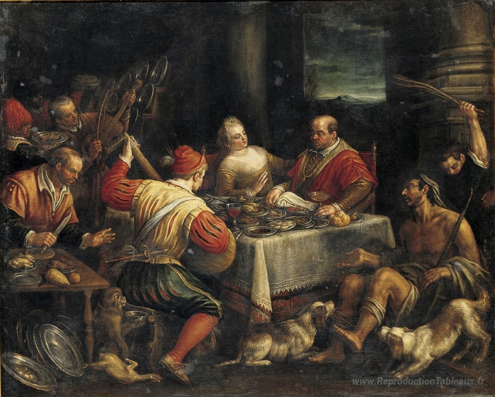 Nous vous proposons une reproduction artisanale sur toile du célèbre tableau 'Scène de banquet' de Jacopo Bassano, provenant du Musée de la Reproduction.