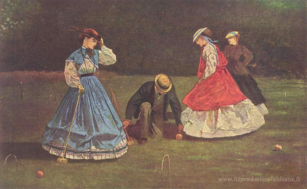 Nous vous proposons une reproduction artisanale sur toile du célèbre tableau 'Scène de croquet' de Winslow Homer, provenant du Musée de la Reproduction.