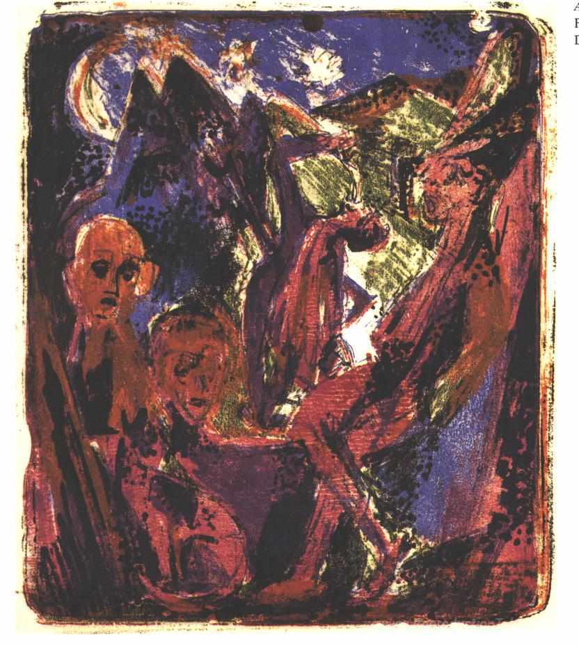 Nous vous proposons une reproduction artisanale sur toile du célèbre tableau 'Scène de même' de Ernst Ludwig Kirchner, provenant du Musée de la Reproduction.
