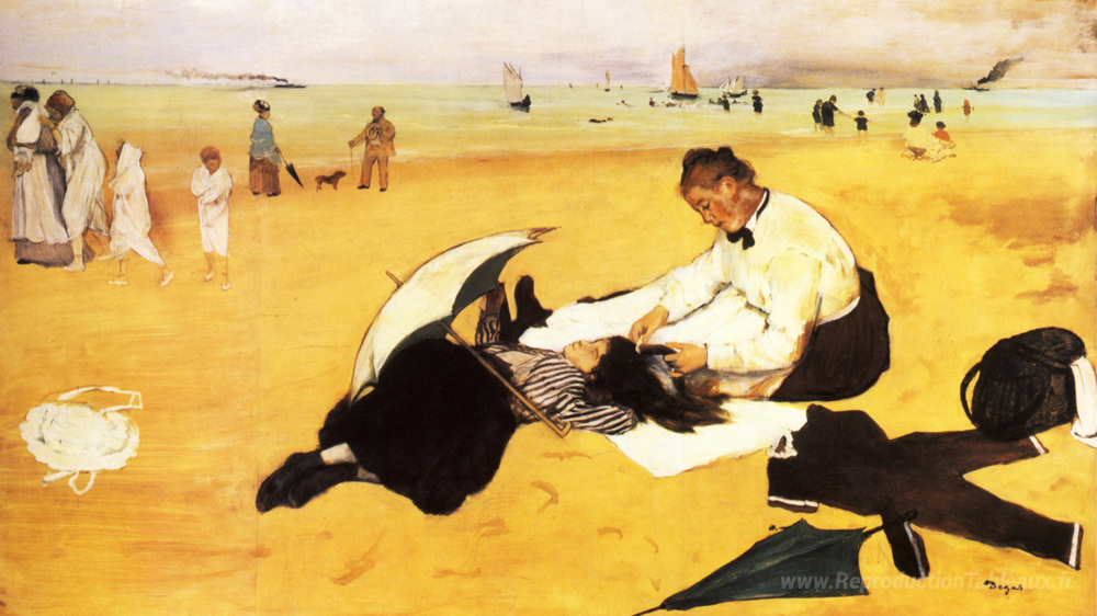 Nous vous proposons une reproduction artisanale sur toile du célèbre tableau 'Scène de plage' de Edgar Degas, provenant du Musée de la Reproduction.